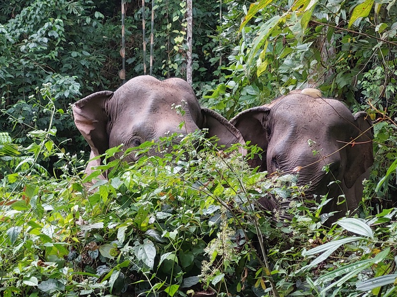 In January, Dor Khoun Meuang gave the release team a real scare as he became quite unwell. Thankfully, the team was able to identify that something was wrong due to a lack of movement from his GPS collar signals. The general movement of the released elephants seems to follow a pattern of spending one to three days in a small space of a few hectares before moving on to new feeding grounds. However, on the rare occasions that Dor Khoun Mueang leaves his surrogate herd to explore on his own, he tends to be more active. This behavior is normal for a male of his age in the wild, as they explore new areas independently, typically trying to associate with adult wild males.